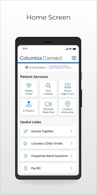 The Columbia Connect app offers a suite of digital services. Through Columbia Connect, easily and quickly communicate with world-class experts from Columbia University Irving Medical Center for services such as Virtual Urgent Care, Video Visits, and more. Whether at home or one of our locations, our resources are now at your fingertips.