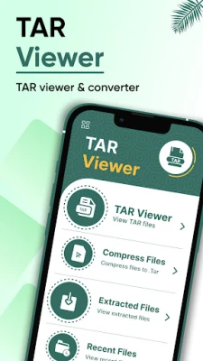 1. TAR extractor is a utility app that unarchives files into TAR format. The home screen of TAR file extractor includes four main tabs; TAR viewer, compress files, extracted files, and recent files.