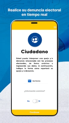 El ciudadano al abrir la aplicación encontrará una pantalla de bienvenido la cual cambiará cuando se cargue y mostrará la pantalla de inicio en la que el usuario debe solucionar el captcha, presionar el botón ingresar y aceptar los términos y condiciones que se describen para el uso de la aplicación. Una vez acepte los términos podrá visualizar las noticias de las elecciones y en la parte inferior podrá dirigirse a la opción de denuncias o consulta.